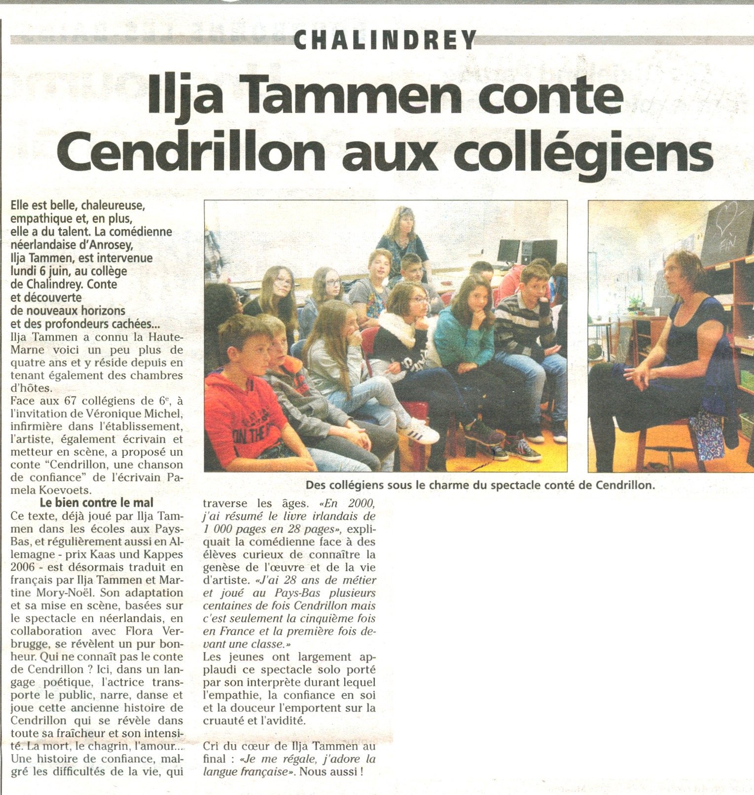 Ik heb mijn theatersolo ‘Assepoes’ op een frans Collège mogen spelen. Naast het gastvrouwschap van La perle d’Anrosey pak ik namelijk zo zoetjes aan mijn acteerwerk weer op. Hoe bijzonder is dat, om als nederlandse in de verfijnde franse taal te mogen acteren. En dat nog wel op uitnodiging van de lerares frans ! Ik voel me vereerd. En, al zeg ik het zelf, wat ging het goed… Ruim een uur duurt deze prachtige tekst van Pamela Koevoets.